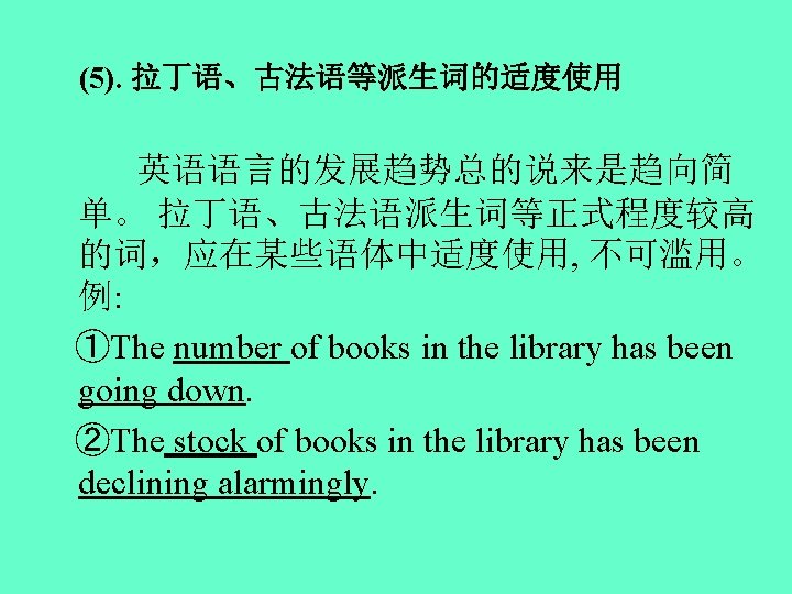 • • (d). 正 式 例4.In the summer of 1969,the Administration publicly urged an easing of tensions with China. 名词化结构 easing of tensions的使用,使 句子显得正式、庄重。如果改成⋯urge to ease the tense relationship…”, 则显得随便而正式 程度不足。