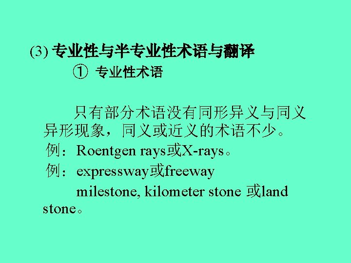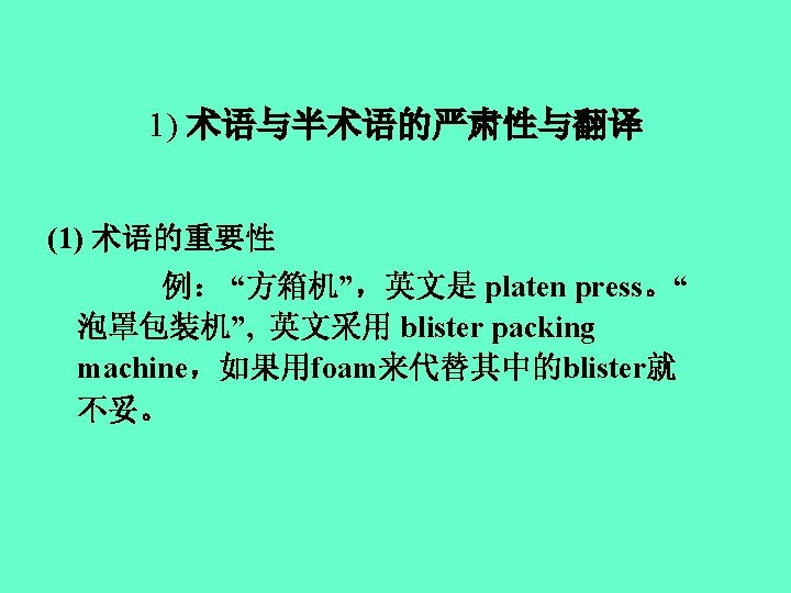 • C). 用同义词替代 • 原文:另一种方法是化学方法。 • 译文:Another method is the chemical process。 原文:电子管通常用来放大,而真空管则是电子管的另一 名称。 译文:An electron tube is generally used for amplification, and vacuum tube is another +name for this device。 • • D). 以局部代替整体(复合词组) • 原文:YG 611 S型日晒气候色牢度测试仪的 作原理为……。 该色牢度测试仪符合试验方法要求……。本测试仪适用于 染色中的耐光色牢度试验及光老化试验。 • 译文:The Xenon Arc Light & Weather Fastness Tester works on the follwing principles: … The Model YG 611 S complies with the requirements for the test methods: … The tester is suitable for the colour fastness-to-light test in dyeing… •