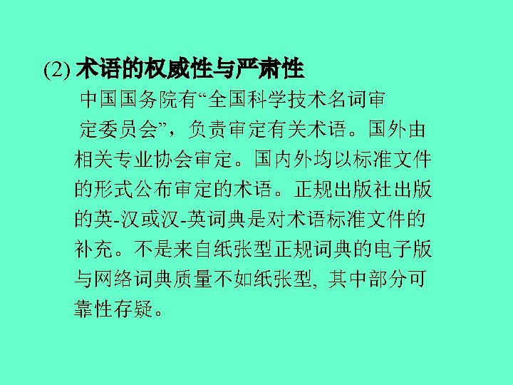 ③ 某些术语与专有名词的翻译错误举例 以下译例中, (A)为错句。 例(1)投标资格预审 (A) investigation of bidding qualification ( B ) prequalification (pre-qualifying) 例(2)(投标中的)联营体 (A) co-operating unit ( B ) joint venture 例(3)就地清洗装置 (A) On-the-spot cleaning equipment (B) CIP apparatus 例(4)羊栖菜深加 处理。 (A)Further Processing of Yangxicai Marine Alga (B)Further Processing of Hijiki •