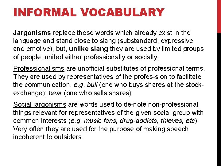 INFORMAL VOCABULARY Jargonisms replace those words which already exist in the language and stand close to slang (substandard, expressive and emotive), but, unlike slang they are used by limited groups of people, united either professionally or socially. Professionalisms are unofficial substitutes of professional terms. They are used by representatives of the profes sion to facilitate the communication. e. g. bull (one who buys shares at the stock exchange); bear (one who sells shares). Social jargonisms are words used to de note non professional things relevant for representatives of the given social group with common interests (e. g. music fans, drug-addicts, thieves, etc). Very often they are used for the purpose of making speech incoherent to outsiders.