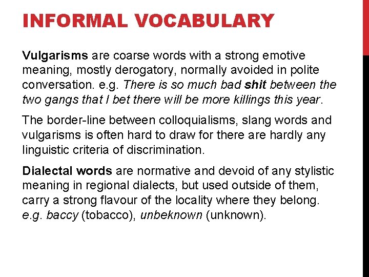 INFORMAL VOCABULARY Vulgarisms are coarse words with a strong emotive meaning, mostly derogatory, normally avoided in polite conversation. e. g. There is so much bad shit between the two gangs that I bet there will be more killings this year. The border line between colloquialisms, slang words and vulgarisms is often hard to draw for there are hardly any linguistic criteria of discrimination. Dialectal words are normative and devoid of any stylistic meaning in regional dialects, but used outside of them, carry a strong flavour of the locality where they belong. e. g. baccy (tobacco), unbeknown (unknown).