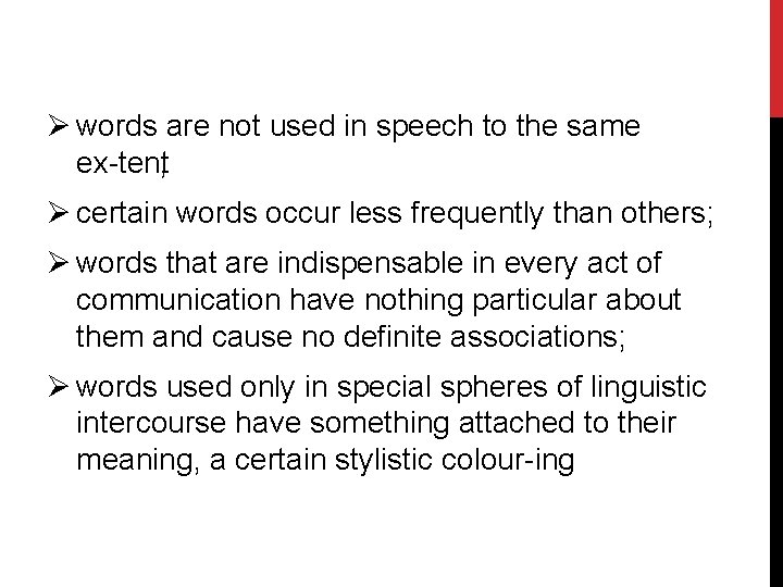 Ø words are not used in speech to the same ex tent; Ø certain words occur less frequently than others; Ø words that are indispensable in every act of communication have nothing particular about them and cause no definite associations; Ø words used only in special spheres of linguistic intercourse have something attached to their meaning, a certain stylistic colour ing.
