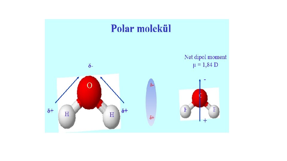 Polar molekül: Bir molekülde + ve – yüklerin ağırlık merkezlerinin üste gelmediği moleküllere polar moleküller denir. Suda da bulunan bu özellik (polarlık ) nicel olarak dipol momentle verilir. Bir molekülün + ve – yük merkezlerinin yükü q ise ve yükler arası uzaklık da d ise μ ile gösterilen dipol moment μ=d. q ile verilir ve birimi debyedir (D). Polar moleküllere dipol moleküller de denir. Ancak içinde polar bağ bulunan her molekül dipol olmayabilir. CCl 4 ve CO 2 gibi. Su molekülleri arasında 3 türlü bağ vardır. a) Dipol-dipol bağları b) Hidrojen bağları c) Van der Waals bağları Kovalent bağlardan 8 -10 kez daha zayıf olan hidrojen bağları Van der Waals bağlarından çok kuvvetlidirler. Suyun sıcaklığı artıkça moleküller arsındaki boşluklar büyümekle birlikte 100 0 C ye kadar hidrojen bağları etkili olduğundan 100 0 C deki suyun buharlaşma ısısı 540 kcal/g gibi yüksek bir değerdedir