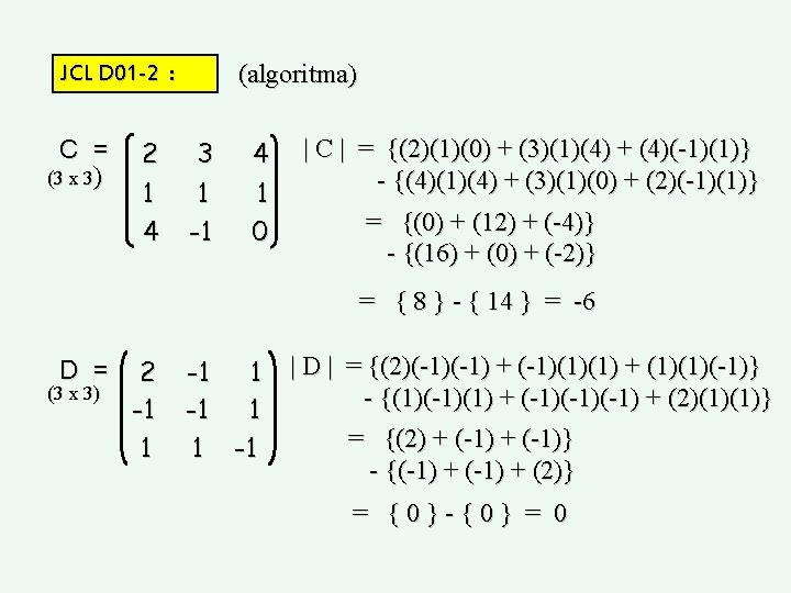 JCL D 03 -1 B : (penyapuan lajur) Pengolahan lajur dengan 2 3 1 1 4 1 0 F 1. 2(-1) F 3. 2(-1) -2 0 4 4 1 1 0 0 -1 2 3 1 1 1 0 4 1 -1 F 1. 3(4) atas F 2. 3(1) 2 1 4 2 4 1 0 0 0 -1 Det. M = (2)(1)(-1) = -2 4 1 1 0 0 -1