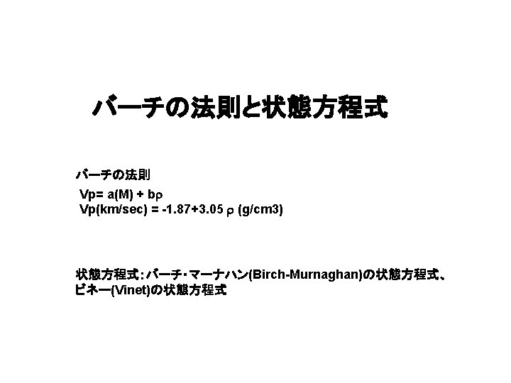 状態方程式 Equation of State 通常の固体の状態方程式 Birch-Murnaghanの状態方程式 (Birch-Murnaghan equation of State やわらかい物質に対する状態方程式 Vinetの状態方程式 (Vinet Equation of State)
