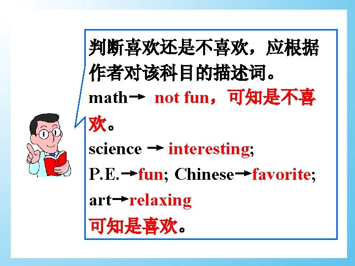 A’s favorite subject is Chinese. He likes it because it’s relaxing. His Chinese teacher is Mr. Wu. B’s favorite subject is history. She likes it because it’s interesting. Her history teacher is Ms. Li. C’s favorite subject is English. He likes it because it’s fun. His English teacher is Ms. Hu.