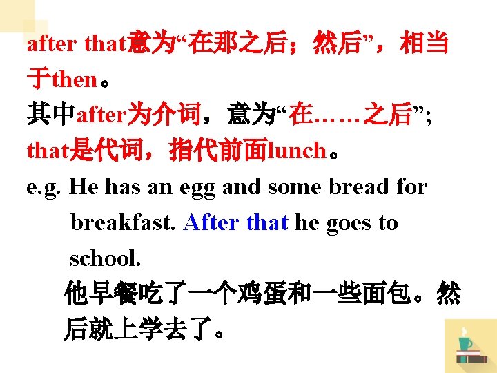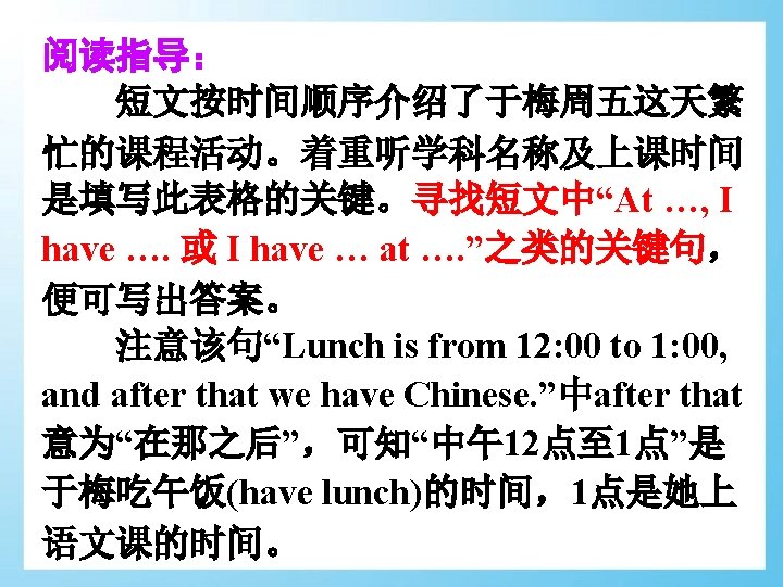 4. Lunch is from 12: 00 to 1: 00, and after that we have Chinese. 介词短语 from … to … 意为“从……到 ……”,用来表述时间、地点等范围。 e. g. We go to school ___________. from Monday to Friday 我们从星期一到星期五上学。 from Beijing to Shanghai It’s far ____________. 北京到上海很远。