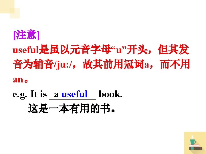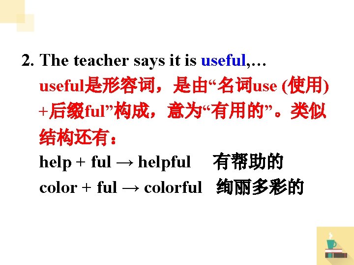 II. 根据句意及所给汉语提示, 写出句中所 缺单词。 1. My brother wants to do something useful _______(有益的). 2. Hello, ______(太太) Green. How are you Mrs. today? 3. Bob has five piano _______(课) lessons/classes every month. 4. I work thirty-five _______(小时) a week. hours 5. The soccer season (足球联赛期) usually _______(结束) in May. finishes