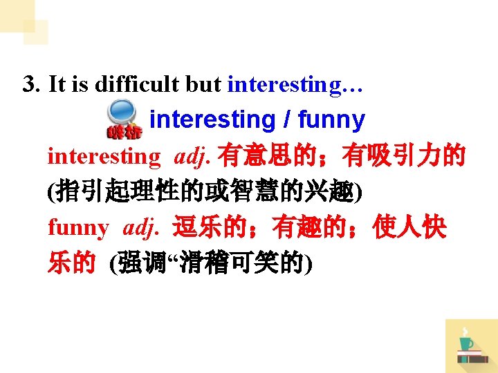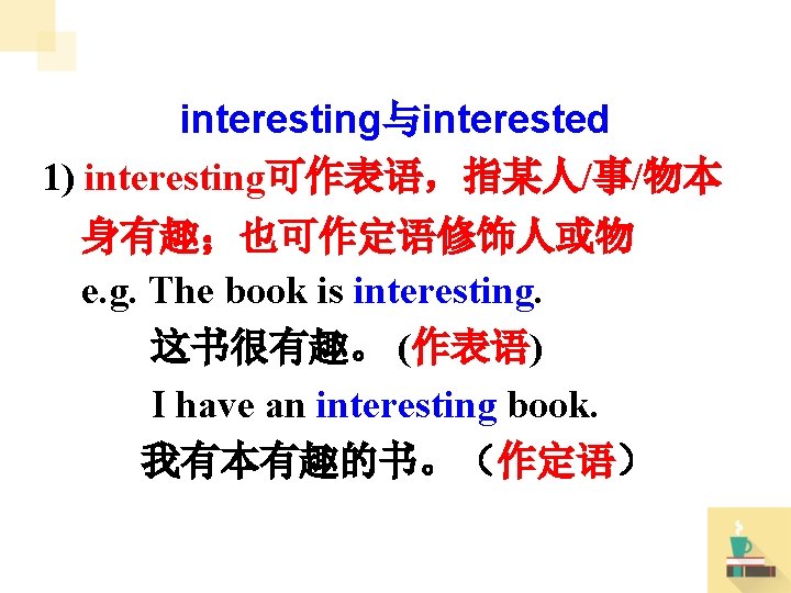 e. g. English is interesting. 英语很有趣。 I find this book interesting. 我发现这本书很有意思。 This is a funny movie. 这是一部搞笑的影片。 This game looks fun. 这个游戏看起来好玩