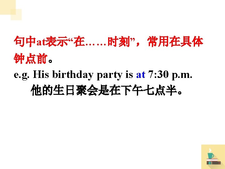 Thursday 28 th Friday 29 th A. M. 08: 00 math A. M. 08: 00 Chinese 09: 00 English Saturday 30 th Soccer game 10: 00 Chinese 10: 00 art 11: 00 history 11: 00 P. E. P. M. 12: 00 lunch P. M. 12: 00 lunch 01: 00 geography 01: 00 math 02: 00 English 02: 00 history Sunday 31 st Bill’s birthday party
