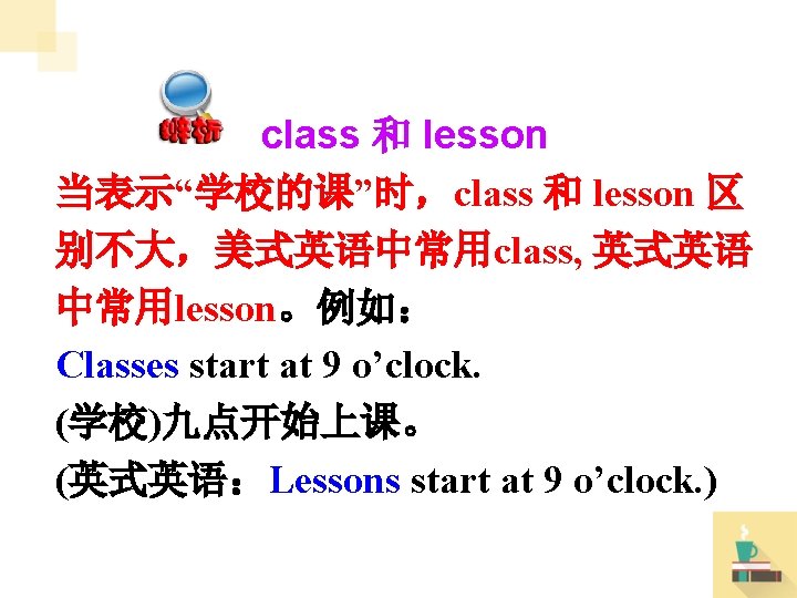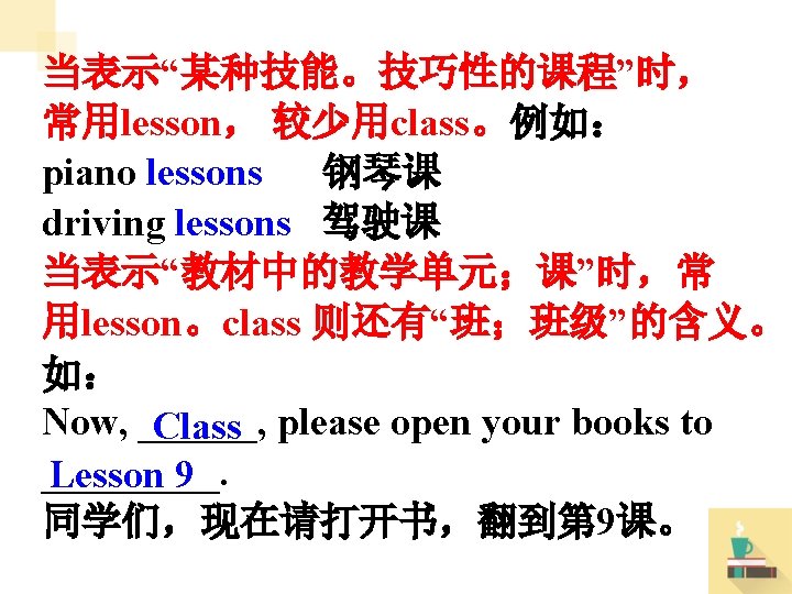 lesson 用作名词,意为“课;课程”。 常用短语: have lessons 上课 do one’s lessons 做功课 Lesson One = the first lesson 第一课