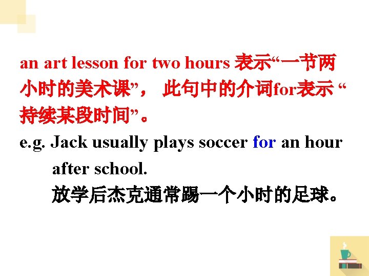 5. My classes finish at 1: 50, but after that I have an art lesson for two hours. finish作动词,意为“结束”,常用于 finish doing sth. 意为做完某事。 e. g. The English Party finishes at 6: 00 p. m. 英语聚会下午六点结束。 finish doing I ______ my homework at 9: 00. 我九点完成我的作业。