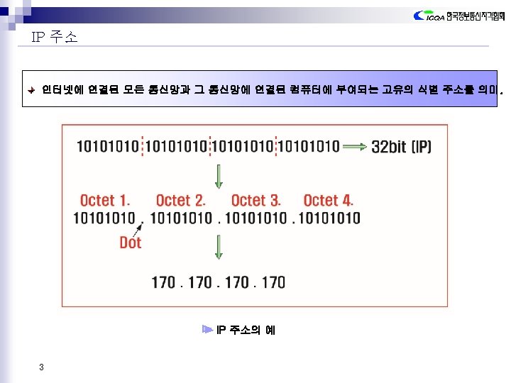 Subnet Mask(계속) Subnetting의 예 서브넷 마스크(Subnet Mask)의 사용 예 10 2진 MASK 10진 MASK 2진 HOST Subnet 수 Host 수 0000 0 1111 Network ID X 10000000 128 01111111 1 128 11000000 192 00111111 2 64 11100000 224 00011111 6 32 11110000 240 00001111 14 16 11111000 248 00000111 30 8 11111100 252 00000011 62 4 11111110 254 00000001 126 2 1111 255 0000 254 1 서브넷 마스크(Subnet Mask)
