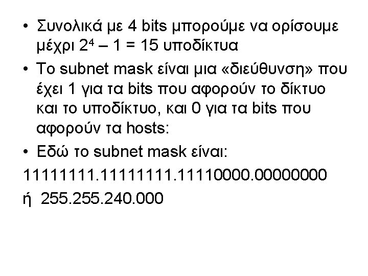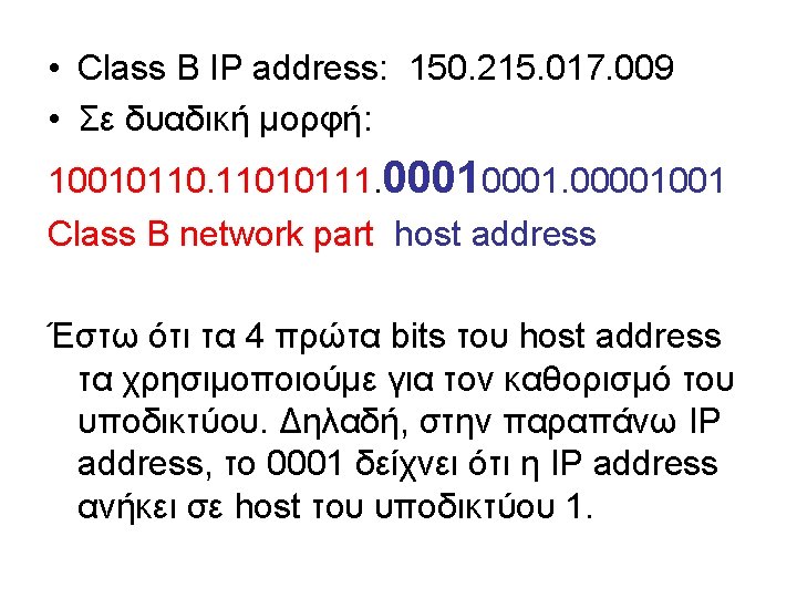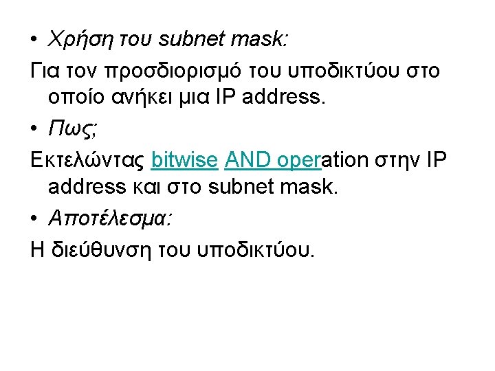 • Στο παράδειγμά μας: Subnet Mask 255. 240. 000 111111110000 <bitwise AND operation> με την IP Address 150. 215. 017. 009 10010110. 11010111. 0001. 00001001 Αποτέλεσμα: 10010110. 11010111. 00010000 Subnet Address 150. 215. 016. 000