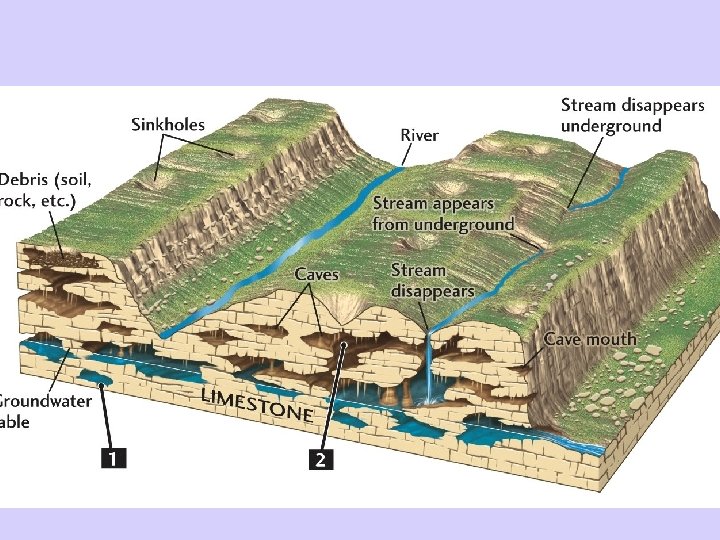 Limestone Caverns • Today - groundwater flows through limestone, dissolves to make underground caverns • If lose groundwater, support in caves disappears – Roof collapse - sinkhole