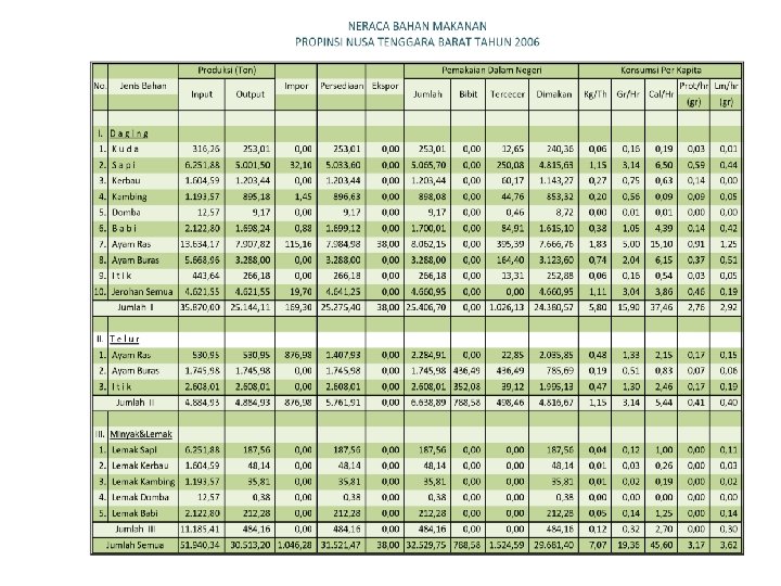 • • Keadaan konsumsi --- Data konsumsi BPS (Susenas 3 th/ kali) Keadaan ketersediaan pngn pd tkt konsumsi --- Data ktsd Deptan + BPS (1 th/ kali) NBM Neraca Bahan Makanan (NBM) • Food Balance Sheet • S/ tabel tdr kolom 2 info/ data produksi, p’adaan, ▼ yg t’jd komoditi t’sedia u/ dikonsumsi o/ p’duduk s/ daerah pd waktu ttn
