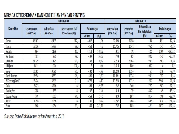 Pertumbuhan Per Tahun Produksi Beras, Jagung, Kedelai, 1992 -2003 Komoditi Padi 1992 1993 1994 1995 1996 1997 1998 1999 2000 2001 2002 2003 7. 99 0. 12 3. 18 6. 75 2. 73 -3. 37 -0. 28 3. 31 2. 03 -2. 77 1. 82 0. 04 Jagung 28. 36 -19. 68 6. 25 22. 12 12. 87 -5. 76 15. 95 -9. 49 5. 14 -3. 41 1. 92 1. 42 Kedelai 20. 17 -8. 63 -8. 37 7. 41 -9. 69 -10. 56 -3. 76 5. 91 -26. 41 -16. 74 -21. 06 13. 36 1. 42 1. 45 1. 52 1. 55 1. 57 1. 59 1. 61 1. 63 1. 66 1. 69 1. 72 Penduduk