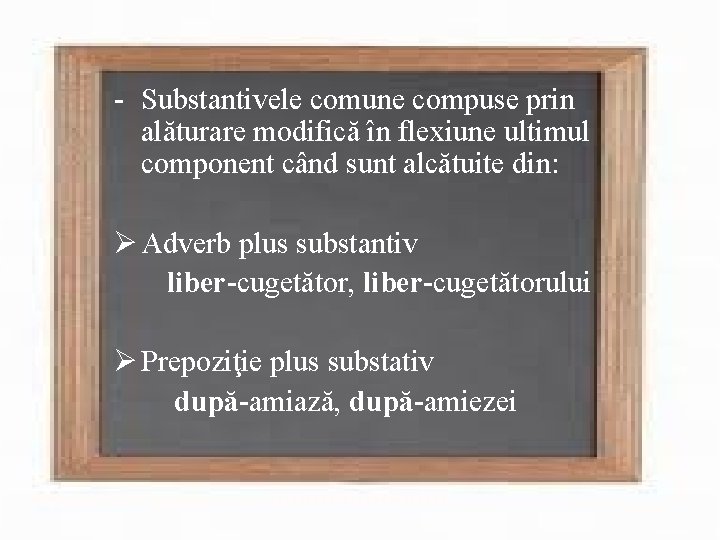 - Substantivele comune compuse prin alăturare modifică în flexiune ultimul component când sunt alcătuite din: Ø Adverb plus substantiv liber-cugetător, liber-cugetătorului Ø Prepoziţie plus substativ după-amiază, după-amiezei