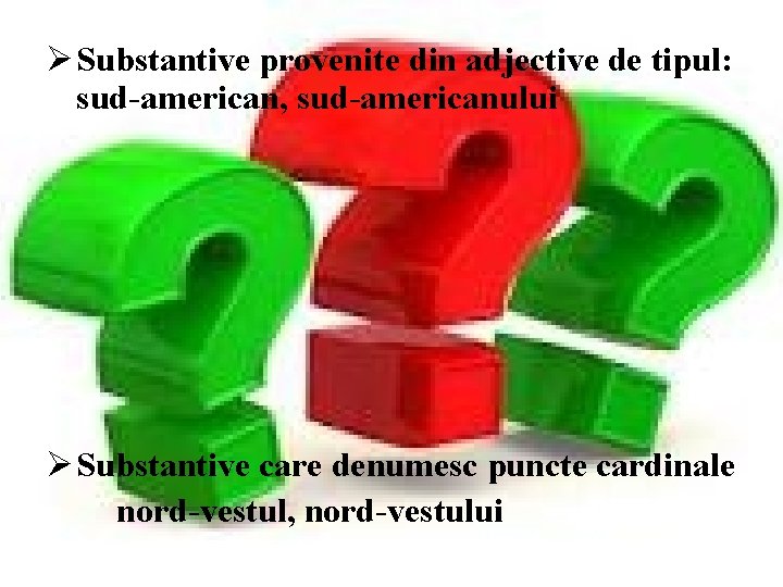Ø Substantive provenite din adjective de tipul: sud-american, sud-americanului Ø Substantive care denumesc puncte cardinale nord-vestul, nord-vestului
