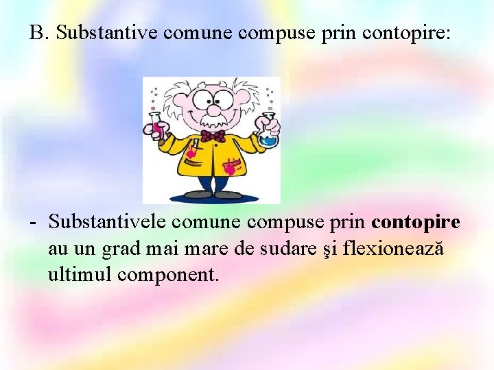 B. Substantive comune compuse prin contopire: - Substantivele comune compuse prin contopire au un grad mai mare de sudare şi flexionează ultimul component.