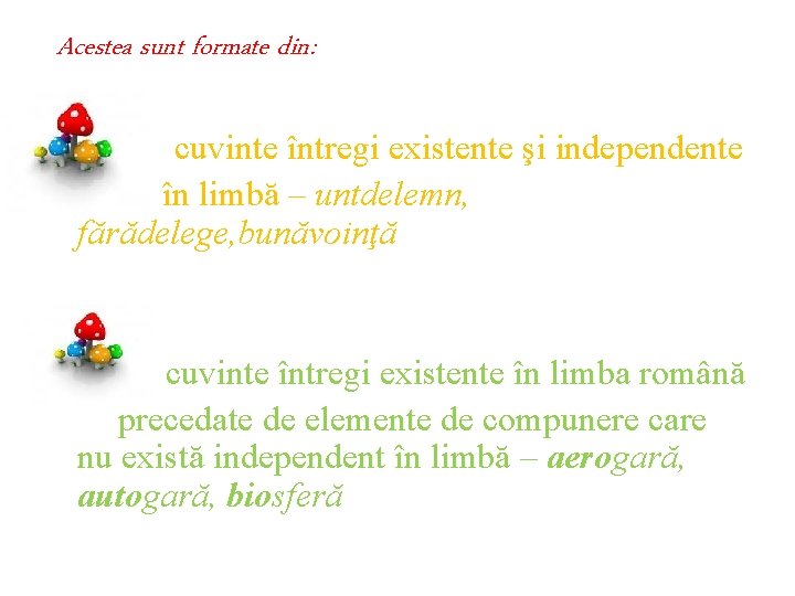 Acestea sunt formate din: - cuvinte întregi existente şi independente în limbă – untdelemn, fărădelege, bunăvoinţă - cuvinte întregi existente în limba română precedate de elemente de compunere care nu există independent în limbă – aerogară, autogară, biosferă