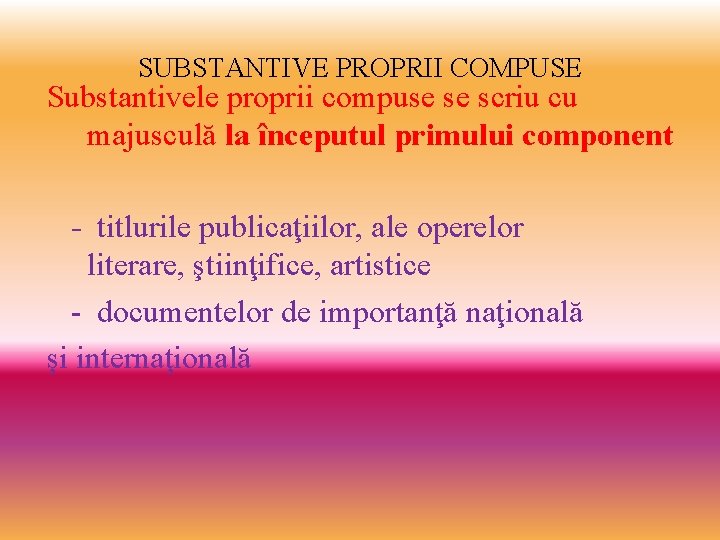 SUBSTANTIVE PROPRII COMPUSE Substantivele proprii compuse se scriu cu majusculă la începutul primului component - titlurile publicaţiilor, ale operelor literare, ştiinţifice, artistice - documentelor de importanţă naţională şi internaţională
