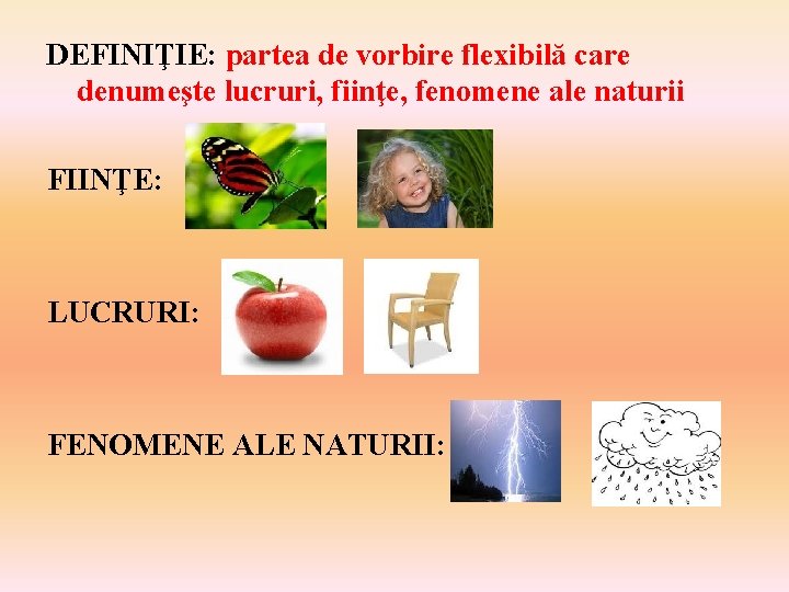 DEFINIŢIE: partea de vorbire flexibilă care denumeşte lucruri, fiinţe, fenomene ale naturii FIINŢE: LUCRURI: FENOMENE ALE NATURII: