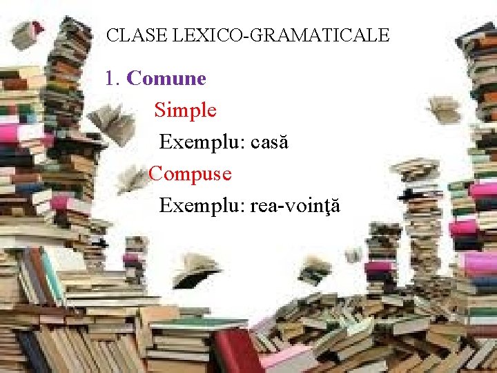 CLASE LEXICO-GRAMATICALE 1. Comune Simple Exemplu: casă Compuse Exemplu: rea-voinţă