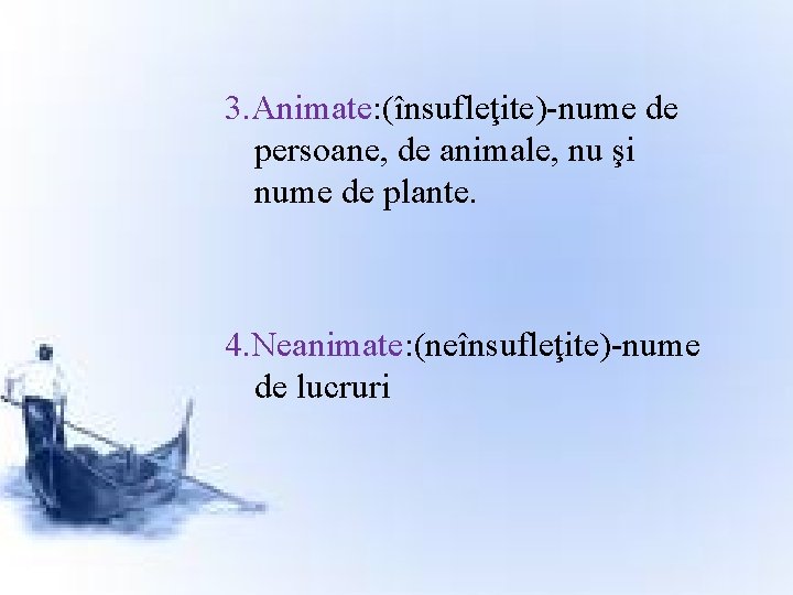 3. Animate: (însufleţite)-nume de persoane, de animale, nu şi nume de plante. 4. Neanimate: (neînsufleţite)-nume de lucruri