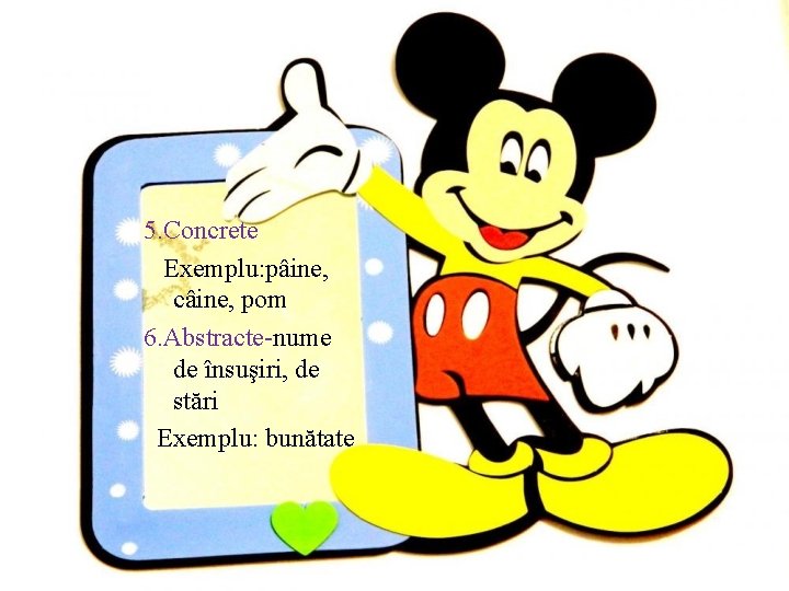 5. Concrete Exemplu: pâine, câine, pom 6. Abstracte-nume de însuşiri, de stări Exemplu: bunătate