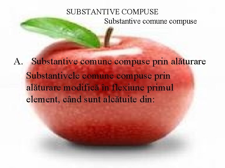 SUBSTANTIVE COMPUSE Substantive comune compuse A. Substantive comune compuse prin alăturare Substantivele comune compuse prin alăturare modifică în flexiune primul element, când sunt alcătuite din:
