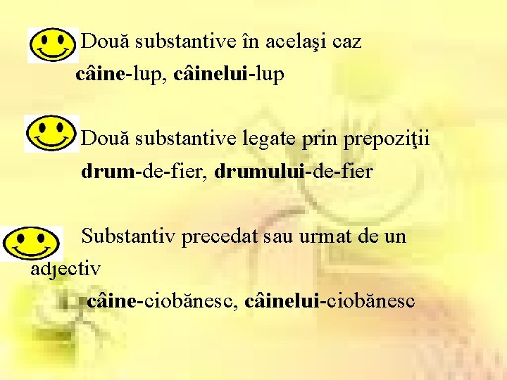 Două substantive în acelaşi caz câine-lup, câinelui-lup Două substantive legate prin prepoziţii drum-de-fier, drumului-de-fier Substantiv precedat sau urmat de un adjectiv câine-ciobănesc, câinelui-ciobănesc