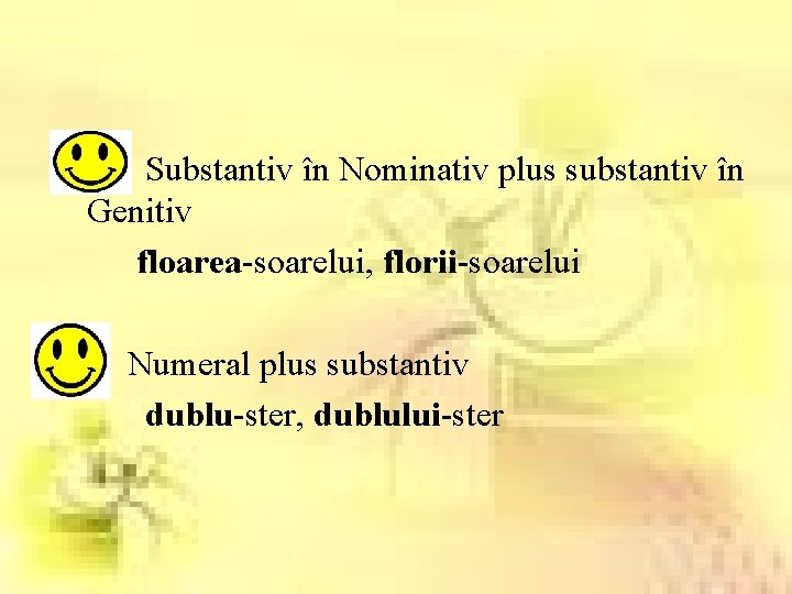 Substantiv în Nominativ plus substantiv în Genitiv floarea-soarelui, florii-soarelui Numeral plus substantiv dublu-ster, dublului-ster