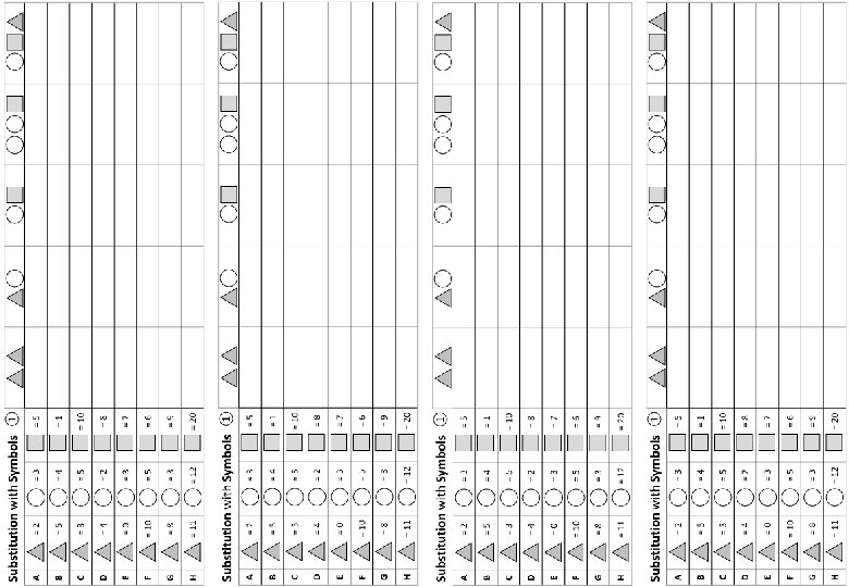 Substitution with Symbols + A 2 B 1 C 4 8 6 3 4 3 6 5 5 E 10 2 8 F 7 4 5 G 8 10 11 Substitution with Symbols B 1 C 4 2 +2 2 − 6 8 6 3 4 3 D 6 5 5 E 10 2 8 F 7 4 5 G 8 10 11 ② On each row (A to G) the value of the symbols change! + 2 − 6 D A ② On each row (A to G) the value of the symbols change! − 2 +2 2 −