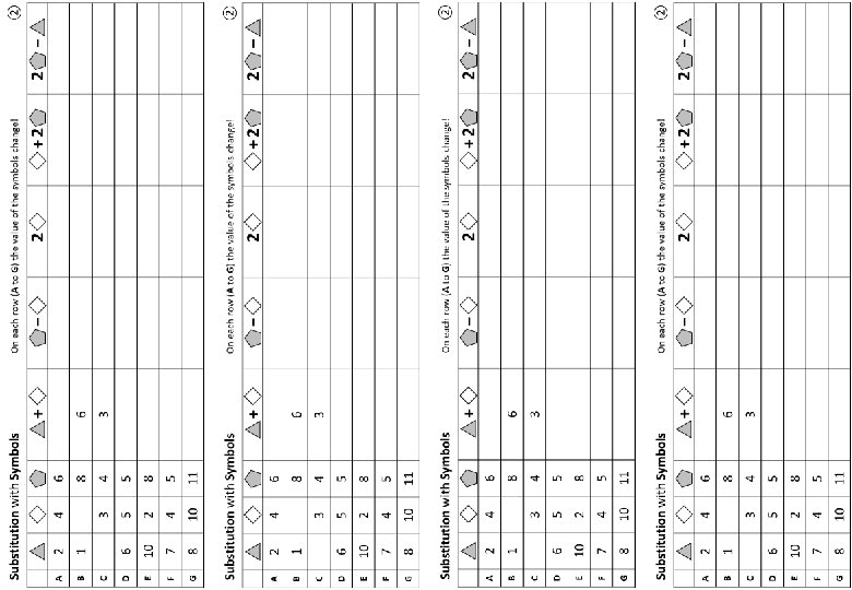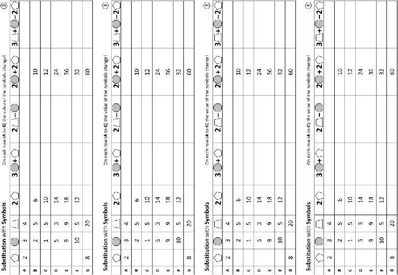 Substitution with Symbols ② On each row (A to G) the value of the symbols change! + − 2 +2 2 − A 2 4 6 6 2 8 16 10 B 1 5 8 6 3 10 21 15 C 0 3 4 3 1 6 11 8 D 6 5 5 11 0 10 15 4 E 10 2 8 12 6 4 18 6 F 7 4 5 11 1 8 14 3 G 8 10 11 18 1 20 32 14