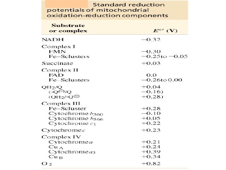 E'o (reduction potential) is a measure of how easily a compound can be reduced (how easily it can accept electron). All compounds are compared to reduction potential of hydrogen wich is 0. 0 V. The larger the value of E'o of a carrier in ETC the better it functions as an electron acceptor (oxidizing factor). Electrons flow through the ETC components spontaneously in the direction of increasing reduction potentials. E'o of NADH = -0. 32 volts (strong reducing agent) E'o of O 2 = +0. 82 volts (strong oxidizing agent) NADH FMN Fe-S Co-Q succinate FAD Fe-S cyt b cyt c 1 cyt c cyt a 3 O 2