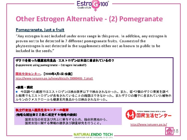 Other Estrogen Alternative - (1) HRT Negative Results of WHI’s Clinical Studies on HRT à In U. S. , HRT prescription significantly dropped since 2002 à “Soaring Needs for Safe and Natural Alternative, Estro. G-100” JAMA 2004; 291; 1770 Side effects of hormones reported Non-hormones release Low-dose hormones release Ref: GBI Research (2009) 17