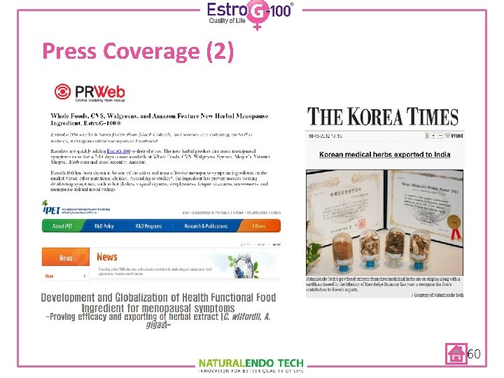 Press Coverage (1) Life Extension Magazine, May 2012 “Estro. G-100™, this multi-compound extract supports balanced estrogenic activity, which in turn inhibits the many symptoms of menopause including female sexual dysfunction” 59