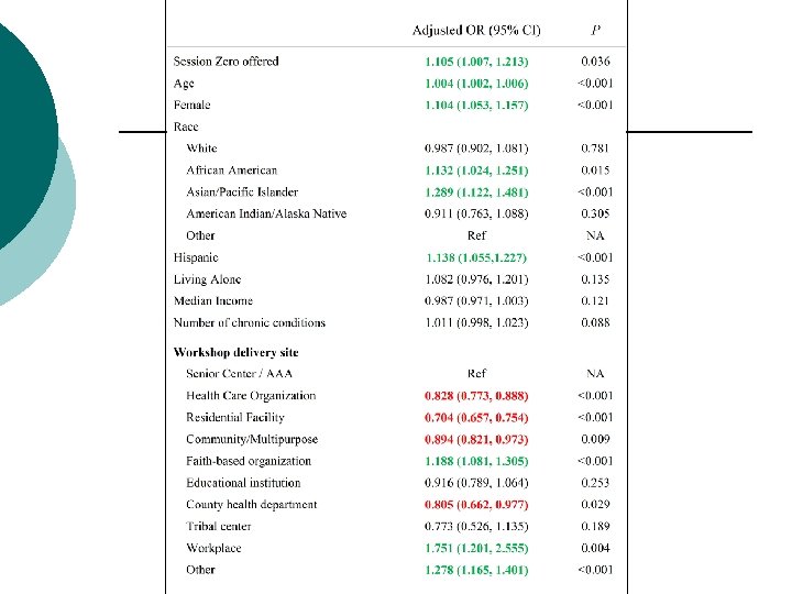 Data ¡ National CDSME Program roll-out via the American Recovery and Reinvestment Act (ARRA) l ¡ 45 states, 2 territories Delivered in a variety of community settings l Public health system and aging services network ¡ Baseline questionnaire and administrative records ¡ Analyses of 80, 987 participants l ¡ Approximately 9, 300 workshops in 1, 200 counties Data Analyses l l Generalized estimating equation (GEE) regression models SAS GEN-MOD procedure with a logit link function