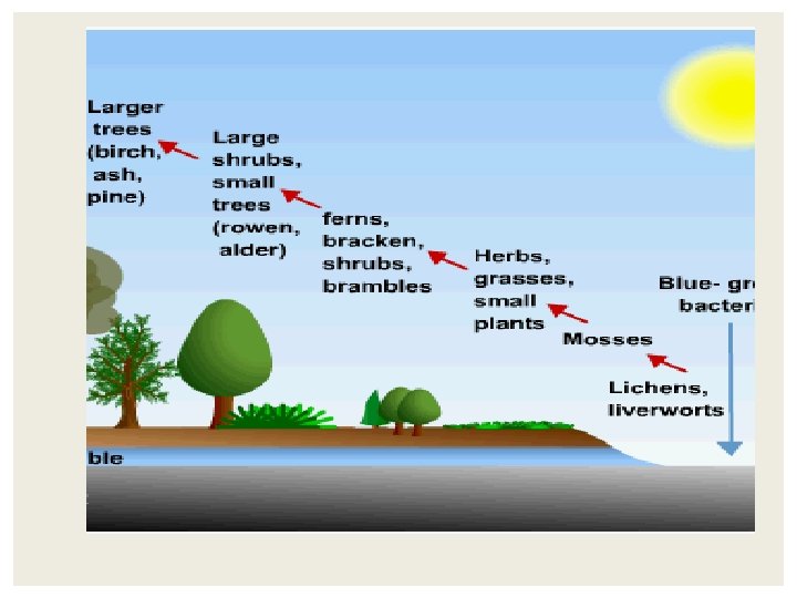 PRIMARY SUCCESSION PROGRESSION: 1. Bare rock with no soil 2. Lichens (pioneer species) breakdown rocks to form soil 3. Grasses (shallow root) and other small plants grow forming even more soil 4. Shrubs (deeper root) and trees grow as amount of soil increases 5. Different animal populations move in as the plant community changes Lichens grasses shrubs trees (climax community)