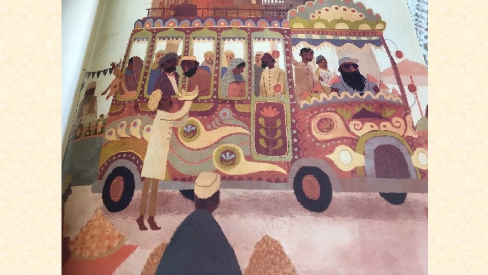 Hamid thought the Central Bus Station was the best place in the world. For him diesel fumes smelled better than evening jasmine. As for revving engines, they sounded sweeter than music. His heart thrilled to the hustle and bustle of street hawkers, the comings and goings of passengers. He saw people from every corner of Pakistan: tribesmen from the North with craggy faces and woollen berets, children of all ages, wedding parties, ladies in black burkas or demure hijab. And the buses! Gorgeously painted in rainbow colours- tasselled, tinselled, and gaudy as decorated camels from Sind. Once they left the Bus Station they picked up speed, thundering towards Sialkot, Islamabad, Karachi, Hyderabad, Faisalabad, Abbotabad and other towns. Faces crowded at windows, hands waved goodbye and extra passengers perched perilously on luggage racks.