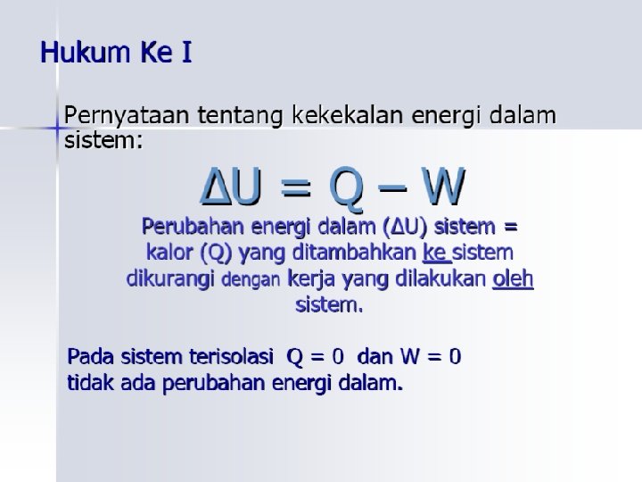Pembahasan soal : a. Diket : Q=2500 J (kalor di tambahkan ke sistem) �W= -1800 J ( sistem melakukan kerja pd lingk) �Jadi: ΔU= 2500 J – (-1800 J) = 2500 J+1800 J=4300 J b. Diket : Q = +2500 J ( kalor ditambahkan ke sistem) W= +1800 J ( krj dilakukan oleh sistem) Jadi: ΔU=2500 J- 1800 J= 700 J (krn kerja tsb merupakan keluaran)