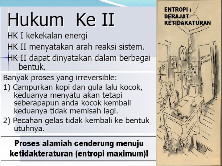 SOAL �Sejumlah kalor = 2500 J di tambahkan ke sistem, dan dilakukan kerja 1800 J pd sistem. Berapa perubahan energi dalam sistem? �Berapa besar perubahan energi dalam jika 2500 J kalor ditambahkan pd sistem dan kerja 1800 J di lakukan oleh sistem?