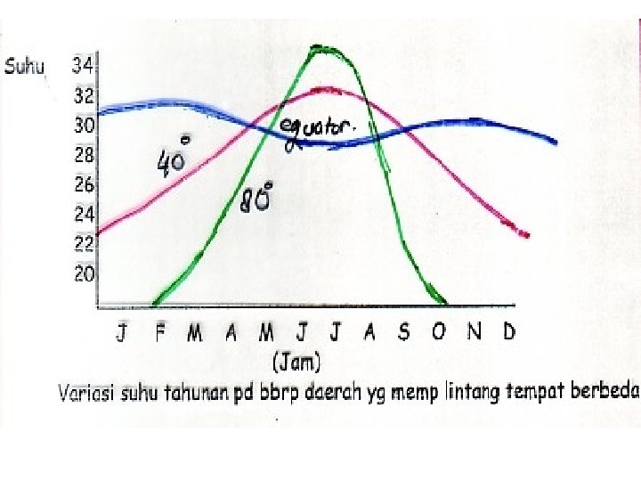 ØDi daerah temperate, fluktuasi suhu diurnal ditentukan oleh neraca energi dan pergerakan massa udara panas dan dingin (front). ØFront : bagian terdepan dr massa udara yg bergerak shg ada * front panas ( bila massa udara tsb lbh panas dr udara sekitar) berasal dr topika *front dingin (bila massa udara bersuhu lbh rdh) berasal dr kutub -Variasi T harian antara keadaan cerah dan berawan hamper sama: Suhu minimum : pkl. 03. 00 suhu maximum: pkl. 13. 00 ØFluktuasi T pada kondisi cerah : cukup besar (perbedaan Tmax & T min ckp besar) ØPada kondisi berawan fluktuasi suhu relative kecil T max: tdk tepat terjadi pada saat matahari mempunyai titik kulminasi tetapi sekitar 13. 30 -14. 00 ØSebab pd saata mencapai ttk kulminasi permk bumi menyerap E mthr belum mencapai max (krn sifat prmk bumi relative lbh lambat melepaskan panas, shg setelah melewati pkl 12 rad yg berasal dr mthr + rad permk bumi yg ckp tinggi T max ØSetelah melewati pkl 14. 00 atau sebelum pkl 12, T tampak rendah