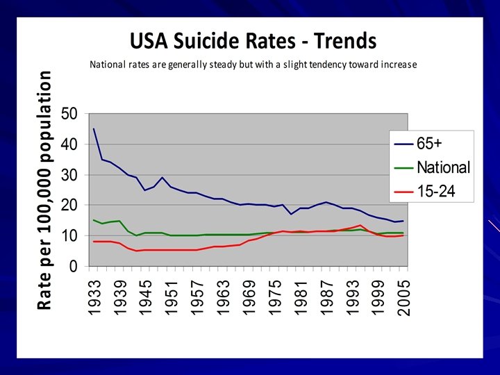 American Numbers: 2006 Data 33, 300 completed suicides in 2006 Rate: 11. 1 per 100, 000 89. 4 per day (equivalent of one commercial jet every other day) One person every 15. 8 minutes Suicide does not respect age, race, religion, social or economic status; it’s an equal opportunity mode of death.
