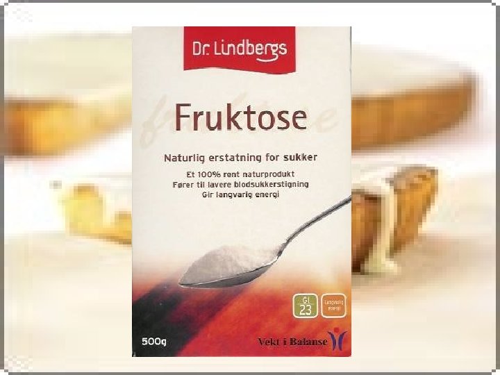 Markedføring av fruktose – baksiden av pakningen har følgende tekst: Erstatt sukker med fruktose og lev bedre. -Fruktose finnes i all frukt, bær og honning -Fruktose har lav glykemisk indeks. Det betyr at fruktose: • Omsettes langsommere i kroppen • Forebygger svingende blodsukker • Forenkler kroppens fettforbrenning • Er en langvaring energikilde som er spesielt gunstig under idrettprestasjoner og krevende fysisk eller intellektuelt arbeid