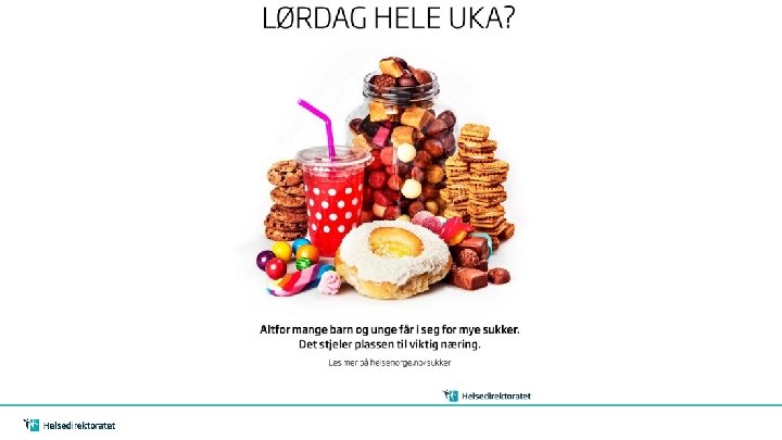 Barn og sukker • Trenger sunn og næringsrik mat og drikke for å vokse og utvikle seg • Mat og drikke med mye sukker gir energi, men ofte lite næring/næringsstoffer • Over halvparten av barn og unge får i seg mer sukker enn anbefalt