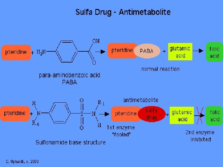 A number of drugs interfere with the biosynthesis of folic acid and tetrahydrofolate: • Dihydrofolate reductase inhibitors (such as trimethoprim and pyrimethamine). • Sulfonamides (competitive inhibitors of PABA in the reactions of dihydropteroate synthetase. • In order for Sulfonamides to inhibit DHPS, they must first be able to get inside of Bacterial cells. This is accomplished by lipophilicity of Sulfonamides due to the presence of the benzene ring that allows sulfonamides to partition through bacterial cell walls.