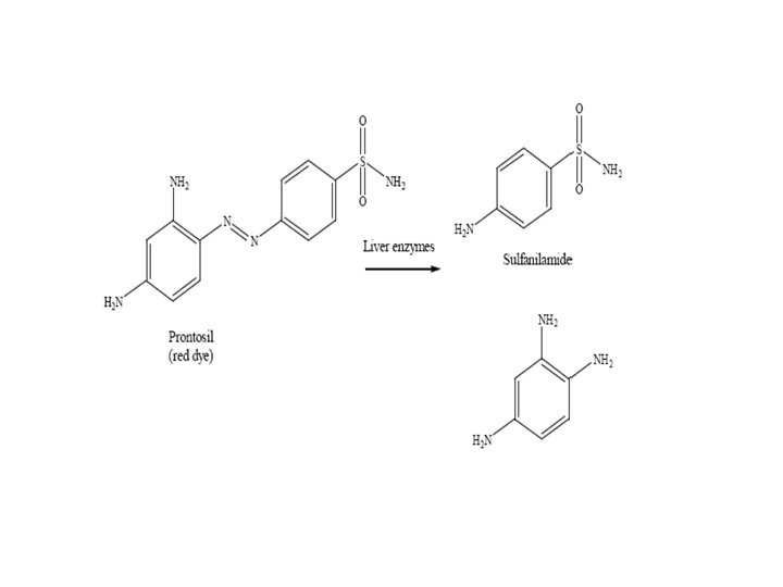 Discovery • Gerhard Domagk used mice infected with haemolytic Streptococcus bacteria as an experimental model and experimented approximately 1000 azo dyes before finding in 1932, a red dye, Prontosil rubrum TM, that was highly active in preventing the death of mice from streptococcal infection. ¨ Prontosil n “Red” -Azo-dye Pre-treatment of bacteria before infection, no effect, but subsequent administration to mice - survival!