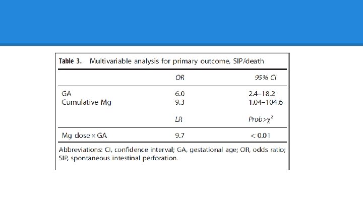 Resultados No entanto: Interação entre menores idades gestacionais e níveis mais elevados de Magnésio foram associados com risco elevado de perfuração intestinal e morte (P<0, 01) A Figura 1 demonstra esta interação, com doses de Mg tendo seus efeitos nos RN de menores idades gestacionais (Tabela 3).